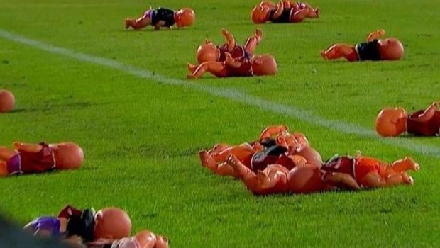 Οι σεκιούριτι απομάκρυναν άμεσα τις κούκλες από τον αγωνιστικό χώρο, ώστε να μην υπάρξει για περισσότερη ώρα διακοπή και να προκληθεί περαιτέρω σύγχυση.