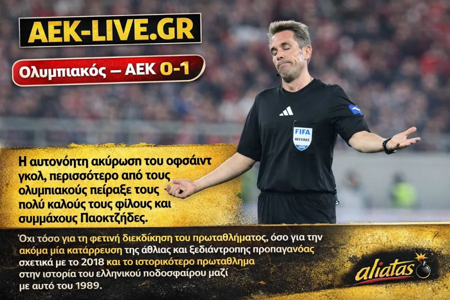Η νίκη της ΑΕΚ μέσα στο «Καραϊσκάκης» με 0-1 επισφραγίστηκε από μια καθοριστική, αλλά απολύτως κανονική διαιτητική απόφαση: την ακύρωση του γκολ ισοφάρισης του Ολυμπιακού στις καθυστερήσεις, μετά από παρέμβαση του VAR για οφσάιντ.