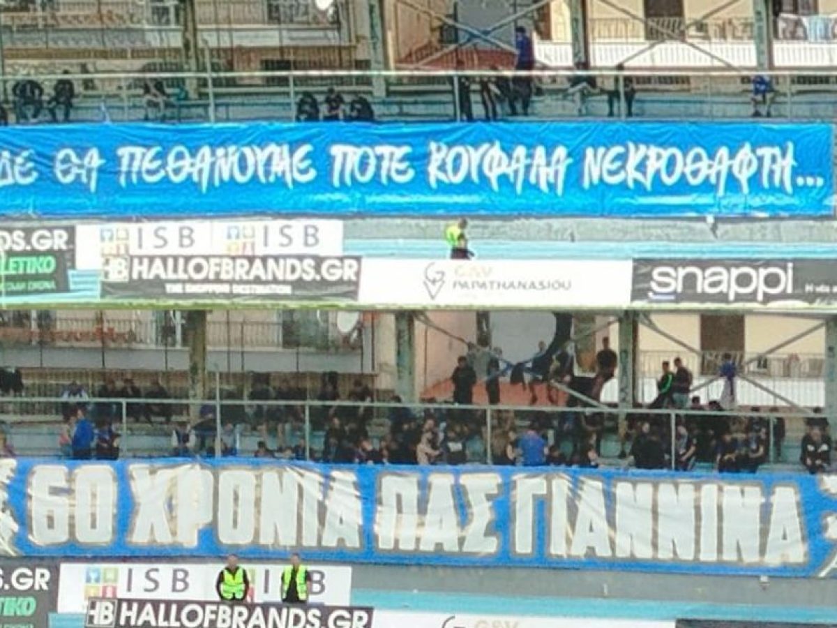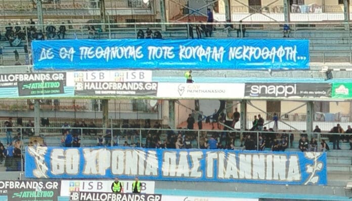 Κυριάρχησαν μάλιστα και δύο πανό από τον Σ.Φ ΠΑΣ Γιάννινα, ένα σε κάθε ημίχρονο. Το πρώτο ανέγραφε «δεν θα πεθάνουμε ποτέ κουφάλα νεκροθάφτη», στέλνοντας μήνυμα ότι ο ΠΑΣ θα βρει τον τρόπο να ξανασταθεί στα πόδια του, παρά τον υποβιβασμό στη Γ’ Εθνική και το δεύτερο ήταν πιο επετειακό, καθώς έρχονται το καλοκαίρι τα 60α γενέθλια της ομάδας, που πρέπει να τη βρουν με μία ισχυρή διοικούσα επιτροπή υπό τον ερασιτέχνη και η οποία θα βάλει τα θεμέλια για γρήγορη επάνοδο στις επαγγελματικές κατηγορίες.