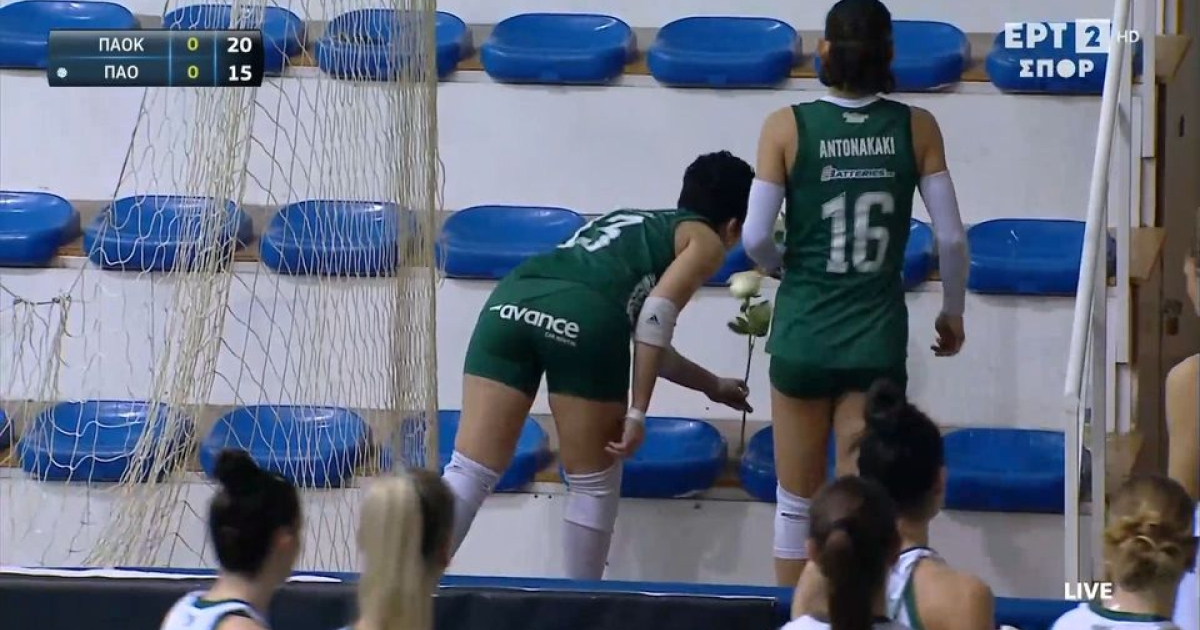 Συγκεκριμένα στο 20-15 υπέρ των γηπεδούχων στο πρώτο σετ, οι «πράσινες» πήγαν στο πέταλο που κάθονται οι οργανωμένοι και άφησαν λουλούδια στη μνήμη των 7 αετόπουλων με τον κόσμο να τις χειροκροτεί.