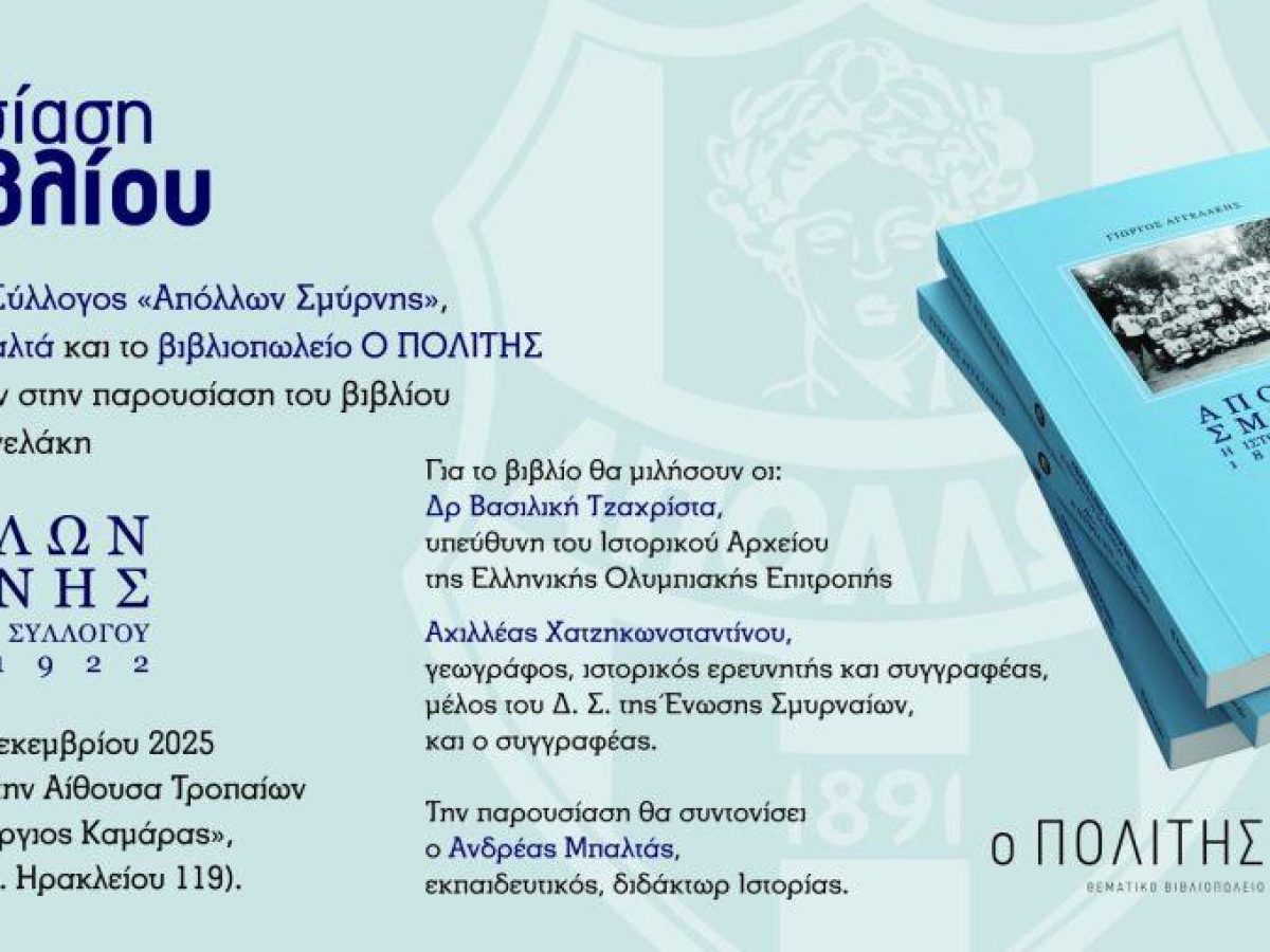 Αύριο (17/12) στις 19:00 στην αίθουσα τροπαίων του «Γεώργιος Καμάρας» θα παρουσιαστεί το βιβλίο «ΑΠΟΛΛΩΝ ΣΜΥΡΝΗΣ. Η ΙΣΤΟΡΙΑ ΤΟΥ ΣΥΛΛΟΓΟΥ 1891-1922» που έγραψε ο Γιώργος Αγγελάκης και το οποίο κυκλοφόρησε πριν από λίγες ημέρες από τις Εκδόσεις Μπαλτά.