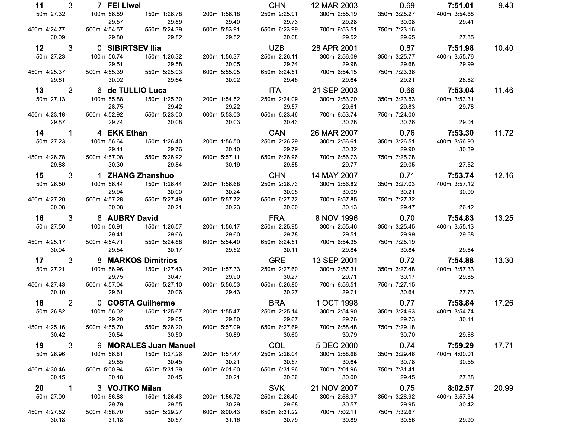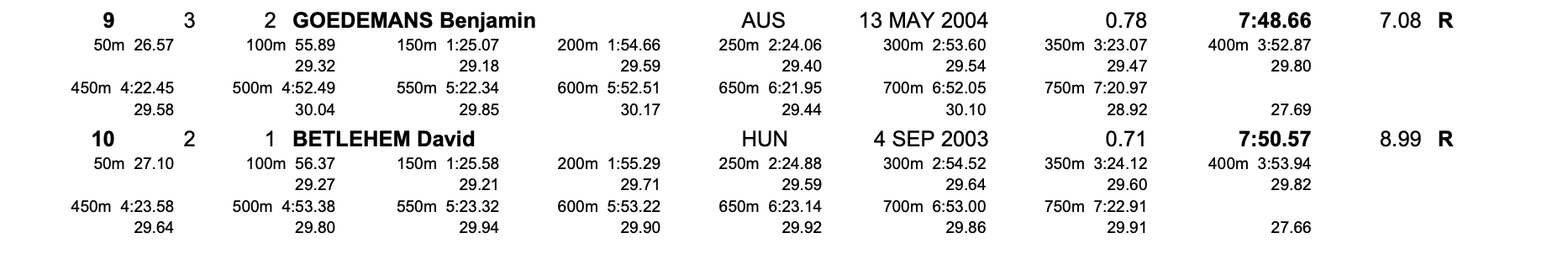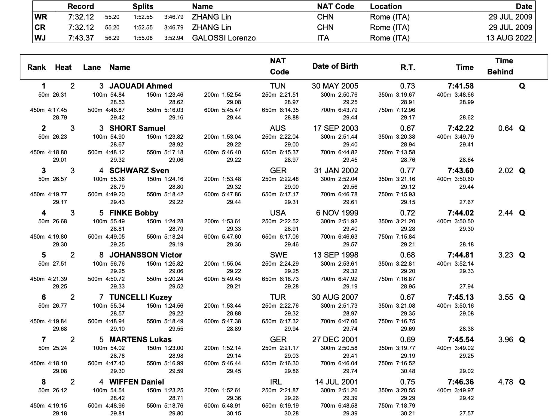 Ο Μάρκος σημείωσε την κορυφαία του φετινή επίδοση (είχε 7:56.73) όμως αυτό δεν ήταν αρκετό για να του δώσει την πρόκριση στον τελικό. H οκτάδα έκλεισε με τον παγκόσμιο πρωταθλητή και χρυσό Ολυμπιονίκη Ντάνιελ Γουίφεν (Ιρλανδία) να παίρνει την πρόκριση οριακά κολυμπώντας σε 7:46.36. Αυτό σημαίνει ότι ο Μάρκος θα έπρεπε να κατεβάσει σχεδόν 2,5 δευτερόλεπτα το πανελλήνιο ρεκόρ (7:48.59) για να πάρει την πρόκριση στον τελικό. Ταχύτερος όλων ήταν ο Τυνήσιος Αχμέντ Τζαουαντί με 7:41.58.