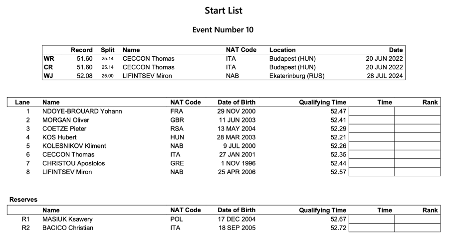 Οι Αμερικανοί που πέρσι πήραν τον τίτλο με τον Χάντερ Άρμστρονγκ, φέτος δεν έβαλαν αθλητή ούτε στα ημιτελικά. Από την άλλη, ο χρυσός Ολυμπιονίκης του Παρισιού στα 200μ ύπτιο Χούμπερτ Κος (Ουγγαρία), πέρασε στον τελικό κάνοντας εθνικό ρεκόρ με 52.21, ενώ ο Πίτερ Κέτζε (Νότια Αφρική) προκρίθηκε κάνοντας ρεκόρ Αφρικής (52.29).